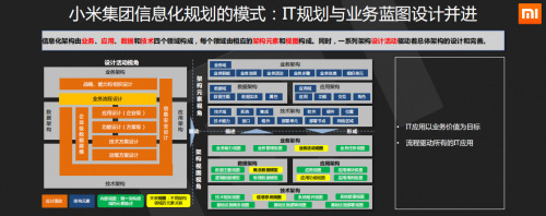 总体来说,小米信息化面临的问题和挑战主要体现在:业务发展需求、信息化自身发展要求以及行业变化趋势等三方面。了解面临的问题后,信息部开始考虑如何规划信息化建设。通过反复的思考和高层对话,在信息部成立了规划组,优先规划出IT发展方向:IT应用以业务价值为目标,流程驱动所有的IT应用。并引入了一些非常好的架构方法,不断的开发系统,形成了现在的小米集团信息化规划的模式:IT规划与业务蓝图设计并进。