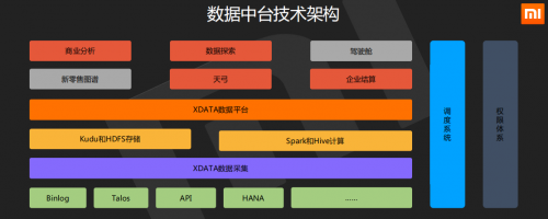 从数据整体来讲,一般分为数据采集、数据清洗,形成数据集市,最后数据分析员才可以在BI去做分析,并提出改进流程,提高业务发展。下图是小米数据中台的架构,底层是大数据平台的基础,在大数据的基础之上搭建了一系列的应用。为了解决以上数据问题,小米信息部成立了X DATA团队专门做数据,更方便地让分析人员在系统上直接分析全部门的任何数据、做报表。只要在权限管控内,分析人员直接得到对应的数据并进行数据分析。小米想从业务端沉淀数据,在共享到X DATA大数据分析,然后发现问题在反馈到业务系统中解决问题。