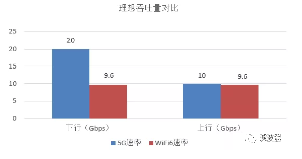 5G的eMBB场景,由于物理层采用256QAM调制方式,FR1频段带宽100MHZ,FR2频段带宽400MHZ,天线数量多达64T64R等,理想下行速率可达20Gbps,上行速率达到10Gbps;Wi-Fi6采用1024QAM,带宽最高160MHZ,天线数量最多8T8R,理想上下行速率为9.6Gbps。