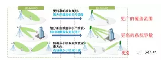 4G通信系统的天线是2天线、4天线或者8天线,5G将引入大规模MIMO天线,天线数量将达到64甚至更高。传统信号覆盖维度为2D MIMO,仅能在水平维度区分用户,massive MIMO结合算法可细分垂直维度和水平维度,实现3D MIMO。