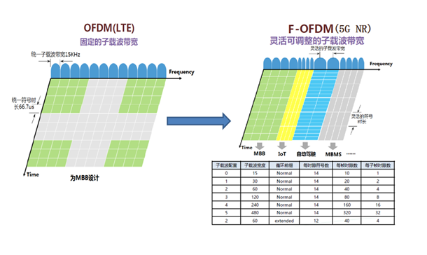 OFDM是目前主流通信标准都在使用的波形,包括3GPP LTE和IEEE 802.11(Wi-Fi)系列都在使用。5G将面向三大应用场景,目前呼声最高是采用华为提出的F-OFDM技术。F-OFDM采用可配置的灵活的子载波带宽、符号长度以及循环前缀长度,以满足超大带宽、超低时延和超大规模连接三大应用场景的需求。