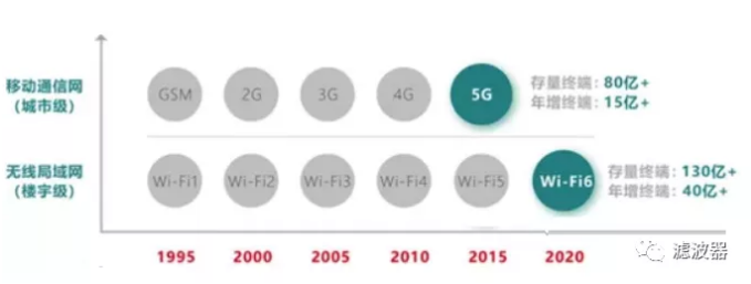无线局域网最成功的技术就是Wi-Fi。第一代的Wi-Fi1(11b)在1997年诞生,经历11b、11a、11g、11n、11ac以及11ax,2018年,Wi-Fi联盟统一用数字代号对Wi-Fi命名,也就是Wi-Fi1直到Wi-Fi6,其中Wi-Fi6在2018年正式开始商用。截止到2018年,Wi-Fi类的终端存量有130亿以上,包括大家使用的手机、平板电脑和PC,以及其他的智能设备。每年新增的Wi-Fi终端的数量超过40亿,是地球人类总数的2/3。