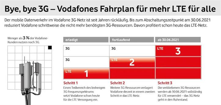 日前,德国沃达丰宣布于2021年6月30日前彻底关闭3G(UMTS)网络,以腾退3G频率资源,重耕给更高效率的4G LTE使用。