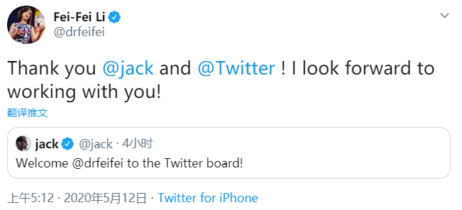 几个小时前,Twitter公司CEO Jack Dorsey官宣——任命AI大牛李飞飞为公司董事会独立董事,且立即生效。