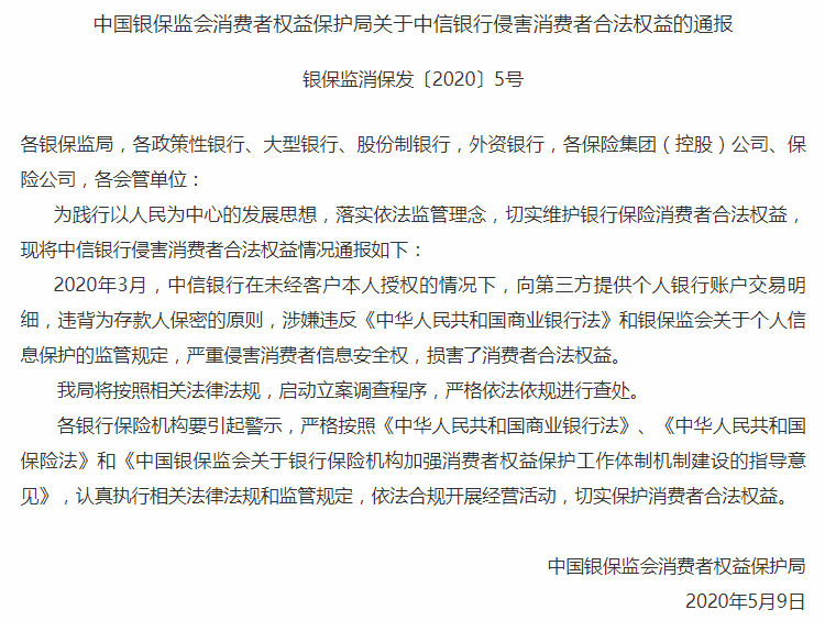 5月9日,中国银保监会发布《关于中信银行侵害消费者合法权益的通报》,通报称,中信银行在未经客户本人授权的情况下,向第三方提供个人银行账户交易明细,违背为存款人保密的原则,涉嫌违反《中华人民共和国商业银行法》和银保监会关于个人信息保护的监管规定,严重侵害消费者信息安全权,损害了消费者合法权益。