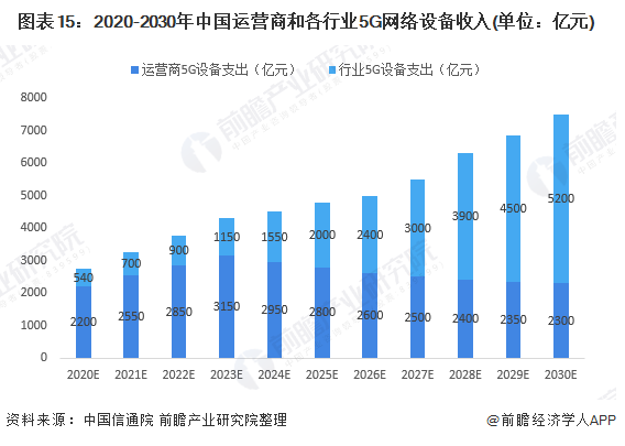 从设备环节看,5G商用中后期各垂直行业将成为网络设备支出主要力量。在5G商用初期,运营商开展5G网络大规模建设,预计2020年,电信运营商在5G网络设备上的投资超过2200亿元,各行业在5G设备各方面的支出超过540亿元。随着网络部署持续完善,运营商网络设备支出预计自2024年起将开始回落。同时随着5G向垂直行业应用的渗透融合,各行业在5G设备上的支出将稳步增长,成为带动相关设备制造企业收入增长的主要力量。2030年,预计各行业各领域在5G设备上的支出超过5200亿元,在设备制造企业总收入中的占比接近69%。