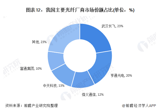 我国光纤缆行业从生产光缆起步,到生产光纤,现在已经取得光纤预制棒技术的重大突破,光纤缆企业大多具备了棒一体化生产能力。当前,我国光纤光缆市场呈“五大”格局,武汉长飞、亨通光电、烽火通信、中天科技、富通集团五家厂商占据了大部分市场份额,每家企业市场份额占比均超过10%。其中武汉长飞全国市场占比达到23%,亨通光电占比20%,明显领先于其他三家企业。