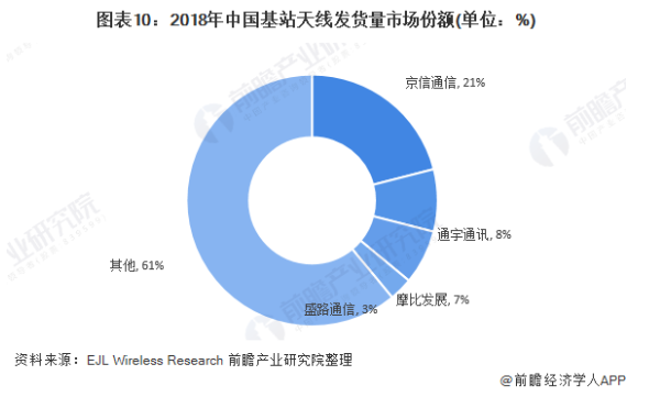 根据EJL Wireless Research于2019年发布的报告,2018年中国基站天线市场份额排名靠前的公司依次为京信通信(21%)、通宇通迅(8%)、摩比发展(7%)、盛路通信(3%)等。从2011年起,京信通信连续八年被行业分析机构EJL Wireless Research评为全球一级基站天线供应商,从2009年起,京信通信的基站天线发货量便稳居全球前三甲。