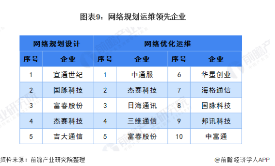 网络规划运维包括无线接入网、业务承载网等前期规划设计和后期优化运维,主要包括中通服、杰赛科技、日海通讯、三维通信、富春股份、华星创业、中富通等。