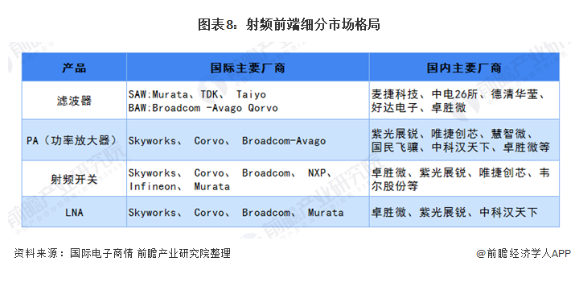 射频前端(RFFE),是移动通信系统的核心组件,主要起到收发射频信号的作用,它包括功率放大器(PA)、双工器(Duplexer和Diplexer)、射频开关(Switch)、滤波器(Filter)、低噪放大器(LNA)等五个组成部分。