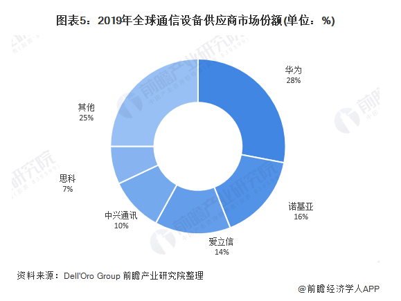 市场研究公司Dell'Oro Group发布的《2019年全球电信基础设施调查报告》显示,2019年全球前五大电信设备供应商分别是华为(Huawei,28%)、诺基亚(Nokia,16%)、爱立信(Ericsson,14%)、中兴通讯(ZTE,10%)和思科(Cisco,7%);这5家电信供应商在2018年的营收市占分别是28%、17%、14%、8%和8%。华为和中兴营收占有率分别较前一年成长,而诺基亚和思科的营收占有率均略下滑1%。