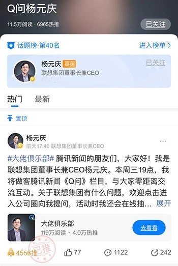 以下为杨元庆在腾讯新闻话题访谈栏目《Q问》上的问答实录: