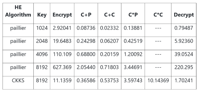 表1展示了Paillier和CKKS的效率对比,时间单位为毫秒,测试机器为Intel(R)Xeon(R)E5-2630 24-core 2.6GHz CPU,63GB RAM,表格C+P中的C代表密文、P代表明文。表格中CKKS的key含义为polynomial modulus degree。