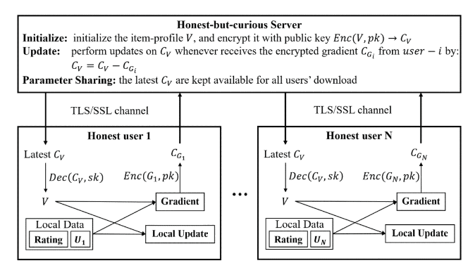 在联邦学习中,因为只需要对中间结果或模型进行聚合,一般使用的同态加密算法为PHE(多见为加法同态加密算法),例如在FATE中使用的Paillier即为加法同态加密算法。为了更好地展示同态加密在联邦学习中的应用,我们在此展示一个同态加密在联邦学习推荐系统中的应用[3]。