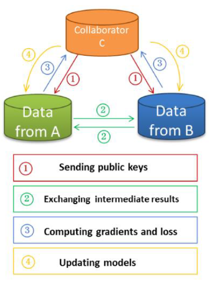 在联邦学习中,多方联合训练模型一般需要交换中间结果,如果直接发送明文的结果可能会有隐私泄露风险。在这种场景下,同态加密就可以发挥很重要的作用。多方直接将中间结果用同态加密算法进行加密,然后发送给第三方进行聚合,再将聚合的结果返回给所有参与者,不仅保证了中间结果没有泄露,还完成了训练任务(第三方可以通过优化系统设计去除)。