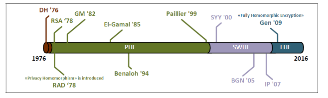 图1展示了三类同态加密算法的研究时间线,同态加密的概念在1976年提出,随后PHE的研究成果逐渐丰富;在Gentry的FHE框架前,LHE研究占主导;2009年后,研究热点集中在FHE。