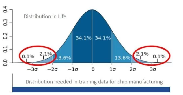 上图为带有标准偏差的正态分布曲线图。在半导体制造中,与驾驶一样,“异常”事件非常少见,但是必须对神经网络进行尽可能多的训练,因为最坏的事件会导致芯片故障。使得整体平均效果还不够好。
