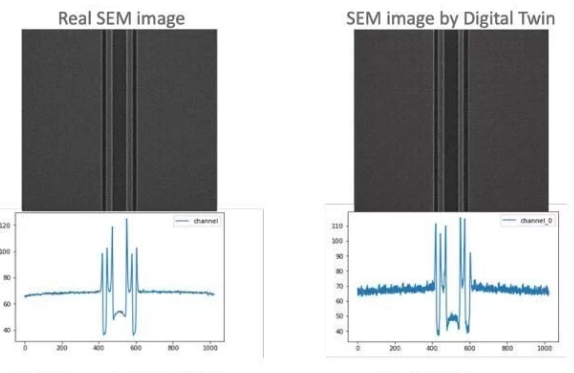 上图由SEM数字孪生生成的掩模SEM图像和真实SEM图像的两个示例。还显示了在同一位置的水平切割线上的图像强度。不仅图像看起来非常相似,而且边缘的信号响应也相似。