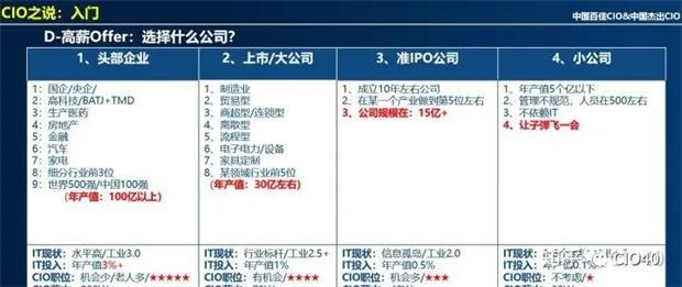 强调CIO在战略层面上的定位,强调CIO在执行层面上的权威,强调CIO在沟通层面上扮演的角色,也就为CIO的事业确定出发展的路线,进而能分析如何调整知识结构和积累工作经验。