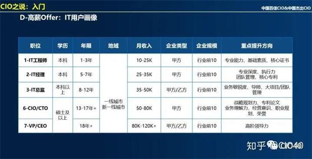 即便我们不赞成这种观念,但思考一下企业里IT主管的职业发展机会,思考一下这些发展机会中对知识结构、工作经验的要求,仍是有价值的,可以帮助IT主管对自己的未来找到更准确的定位。