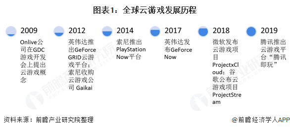 云游戏的发展从国外兴起,2009年,Onlive公司提出云游戏的概念,随后全球各大互联网厂商纷纷布局云游戏业务。2012年起,英伟达开始布局云游戏,推出NVIDIA GRID,2014年索尼推出PlayStation Now平台,2018年,微软、谷歌等分别发布各自的云游戏项目,2019年,腾讯推出云游戏平台“腾讯即玩”,成为国内第一家推出云游戏项目的公司。