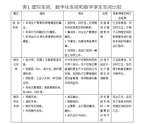 目前,智能车间技术已经从原来的物理空间拓展到了信息空间,其间出现了新的车间相关概念。虚拟车间、数字化车间和数字孪生车间比较如表1所示。
