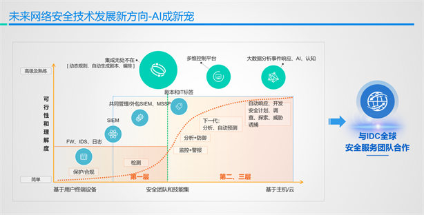 20年前,由于IT架构极简,企业进行网络安全建设往往是简单选择一些合规产品,如防火墙、入侵检测、日志分析等。今天,企业的IT系统已经广泛的部署在云计算环境中,基础设施环境越发复杂,仅仅依靠这些产品已经不足以识别、发现、处置复杂的安全风险。根据IDC研究,未来,企业所选择的网络安全技术将向大数据分析、AI、认知方向发展,具体包括:自动响应、开发安全计划、调查、探索、威胁诱捕等等新的安全技术。