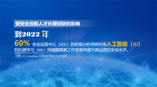 根据IDC的调研,全球网络安全市场需求仍然不断快速增长。IDC预测,到2022年,60%的安全运营中心的初级分析师,将利用人工智能和机器学习持续提高其工作效率,并提升其运营的安全水平。未来将会有更多的安全技术与人工智能技术紧密结合,互相处促进,逐渐成熟。人工智能也将成为网络安全产业未来发展必备的关键技术。