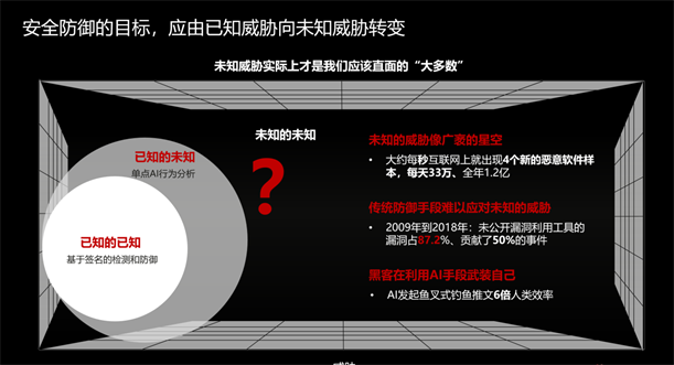 这个过程可以分为三个阶段。首先,对于人们已知的威胁,通过安全防御设备加上人工处理对抗威胁。其次,对于人们已经理解的未知威胁,可以逐渐演进为低度的自主对抗,通过AI技术的加持,从单点防御方面进行一些检测能力的增强,从而能够覆盖未知威胁进攻。可以针对某个具体业务场景,从预防、检测、到威胁处置进行完全闭环的操作,实现一定程度智能、自动化。最后,对于未来的未知威胁,能完全做到这种机器自主对抗,实现在全领域、全方位对抗安全威胁。这将是一个逐步演进的过程。