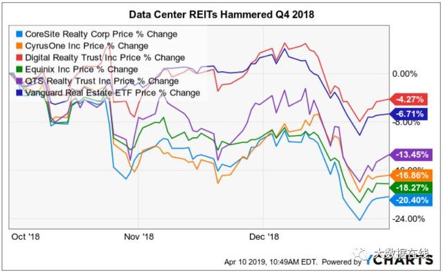 2018年第四季度,以CoreSite Realty、Equinix等代表的数据中心开发与运营公司都经历了下跌潮,其中CoreSite Realty下跌服务达到了20.4%,Equinix下跌幅度也达到了18.27%。不过这种情况在2019年得到了彻底改观。
