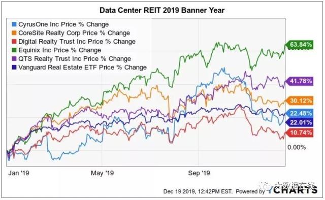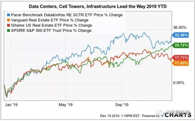 值得注意的是,包括数据中心,无线发射塔和相关基础设施在内的REIT在2019年处于市场领跑地位,跑赢了两个广泛的房地产行业ETF和炙手可热的S&P 500 ETF(目前处于创纪录的高位)。