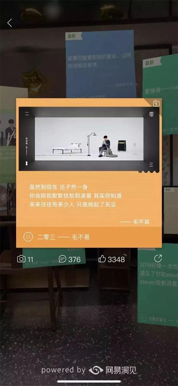 “虽然到现在,还孑然一身,你会陪我默默忧愁到凌晨,其实你知道,来来往往有多少人,只是扬起了灰尘”,这是知名歌手毛不易近期新发的单曲《二零三》中的一句歌词。基于网易云音乐和奈雪的茶的合作,他将这句话贴了一张小纸条放在“美好音乐馆•我拿故事换杯茶”的虚拟留言墙上,给新歌传播带来了意想不到的效果。