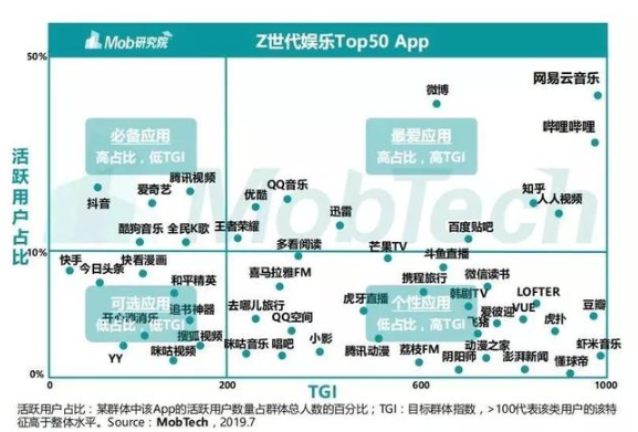据Questmoblie《Z世代洞察报告》显示,网易云音乐无论在Z世代用户占比,还是在活跃渗透率TGI上,都有着明显的优势。同时,在Mob研究院《Z世代大学生图鉴》数据中,网易云音乐以最高活跃用户占比和高TGI成为Z世代最受欢迎的娱乐APP之一。可以说,网易云音乐已经成为95后最大的音乐平台之一。