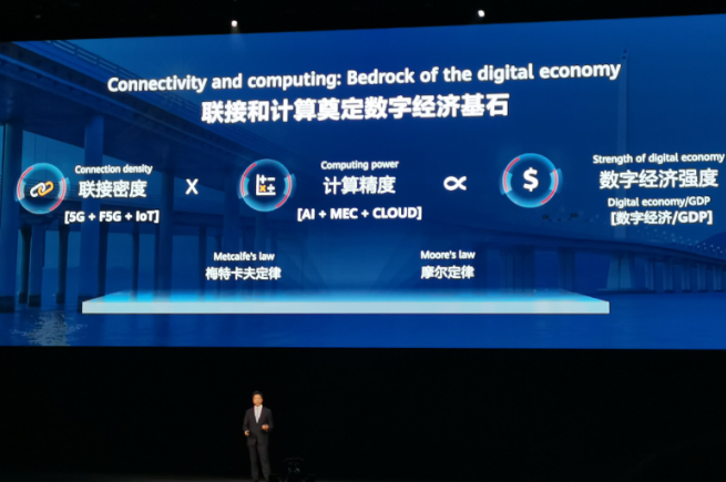 在华为看来,数字经济的基础是联接和计算。5G、物联网是联接技术;云、AI代表计算技术。摩尔定律大家都很熟悉,算力随着时间的推移,变得更加强大而且价格低廉。梅特卡夫定律告诉我们,网络的价值随着联接数的增加而倍增。联接的密度乘以计算的精度,就是数字经济的强度。联接和计算的融合将改变交通、金融、能源等各行各业,为社会创造出新的价值。