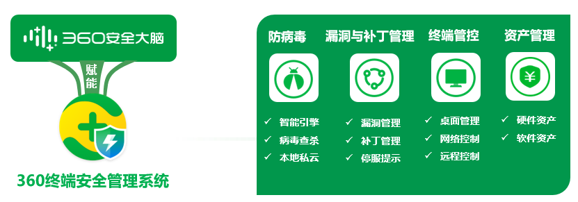 360终端安全管理系统软件是在360安全大脑极智赋能下,以大数据、云计算、人工智能等新技术为支撑,以可靠服务为保障,集防病毒与终端安全管控功能于一体的企业级安全产品。提供病毒查杀、漏洞修复、资产管理、终端管控等诸多功能,帮助企业全面掌控全网终端安全状态,快速处置各类已知未知威胁,有效保障全网终端安全。