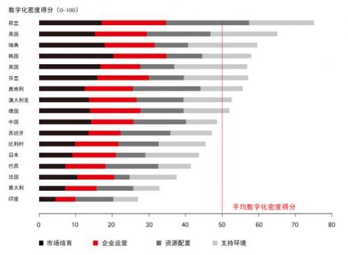 中国的数字密度需要提高10分来获得巨额的数字化增长红利,但这并不容易实现。从上图可以看到,中国目前的数字化密度在17个主要经济体中排名仅列第十位,虽然领先日本、法国、意大利等发达国家,但居荷兰、美国、瑞典、韩国等国家之后,并有较大的差距。