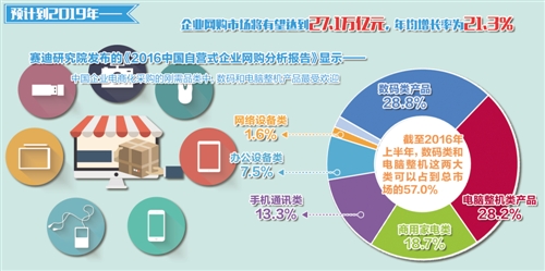 “人工智能技术将提升大数据分析能力,同时利用大数据分析来提升客户行为和信息收集、分析能力,电商平台的数据服务将为企业采购环节提供新的活力。”胡燕表示,预计到2019年,企业网购市场将有望达到27.1万亿元,年均增长率为21.3%。