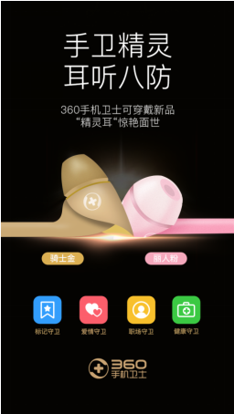 日前,据360手机卫士愚人节新品海报流出显示,精灵耳是根据喜好、性别等特点,为常年身处职场的广大男神、女神们,分别打造出的一款具有“标记守卫”、“爱情守卫”、“职场守卫”、“健康守卫”四大守卫的微型无线蓝牙耳机,从爱情、职场、生活多方面全面守护用户安全。