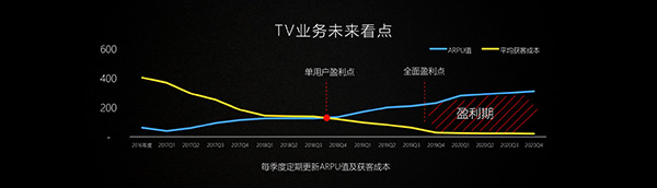 刘耀平称,力争在2019年实现TV业务的全面盈利。未来将通过增加多种TV大屏营销方式和用户收费系统,降低获客成本。
