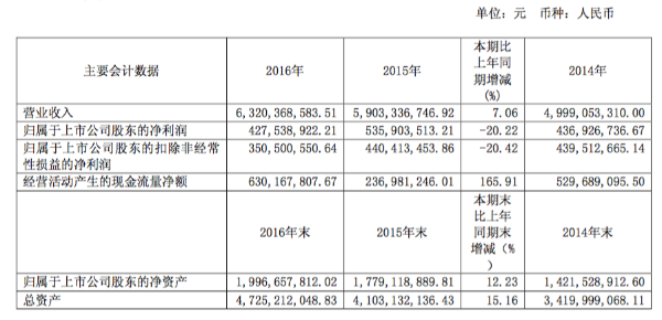 年报显示,2016年度太平鸟的营业收入为63.20亿元,同比增长7.06%,归属股东净利润4.27亿,同比下降20.22%,这是三年来首次下跌。
