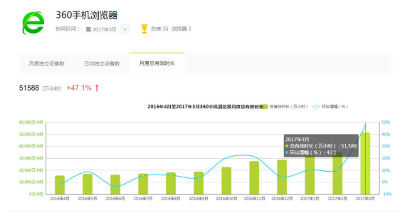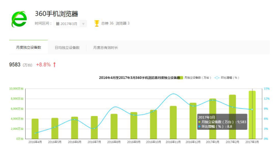 从具体数据来看,挤掉百度、稳坐第一阵营的360手机浏览器增长势头颇为强劲,月度独立设备达9583万台,环比增幅达8.8%明显领先其他三家,同时 360手机浏览器1月、2月的装机量环比增幅分别为11.6%和9.5%,实现了2017第一季度的连续高增长。