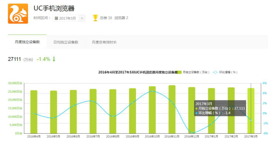 近日,国内领先的互联网数据资讯聚合平台艾瑞咨询发布了2017年3月手机浏览器排名榜单,数据显示UC痛失行业第一宝座,而百度浏览器也掉出了行业前三的队伍,BAT的行业垄断瓦解,手机浏览器呈现出了360手机浏览器、QQ手机浏览器和UC手机浏览器三足鼎立的新格局。