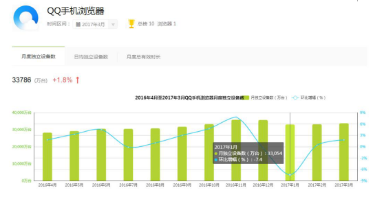 QQ手机浏览器月度独立设备数在Q1季度一路领跑,成长为国内最大的移动浏览器,只不过在1月出现了7.4%的环比负增长,随后两个月稍有回升(分别为0.4%和1.8%)。