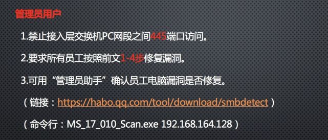 管理员在不确定电脑是否被感染的情况下,可以使用腾讯电脑管家首推的“管理员助手”诊断工具进行检测。企业网络管理员只要下载这一诊断工具,输入目标电脑的IP或者设备名称,即可诊断目标电脑是否存在被感染勒索病毒的漏洞。这一诊断工具的最大好处,是给企业网络管理员一个诊断电脑设备安全防御情况的有效工具,可以帮助企业全面了解电脑设备的安全情况,大大提升管理员工作效率,并可在诊断报告的指导下,对尚未打补丁的健康设备及时打补丁、布置防御。