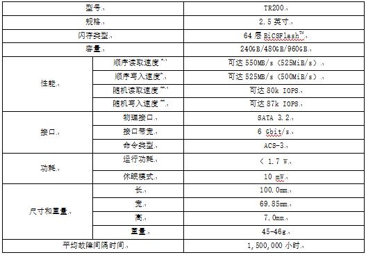 TR200 SSD系列具有高于传统硬盘(HDD)的系统响应能力和数据读写能力,为改善笔记本电脑和台式电脑的用户体验提供了一种简单、便捷的方式。TR200系列采用6 Gbit/s SATA标准接口,顺序读写性能([1])分别达到550 MB/s和525 MB/s([2]),随机读写性能([3])分别达到80000 IOPS (每秒平均的随机读取次数)和87000IOPS(每秒平均的随机写入次数)([4])。并且,在保持高速传输的同时,运行功耗大幅降低,从而可以为长时间使用的用户或者无法及时充电的用户延长电池使用时间。