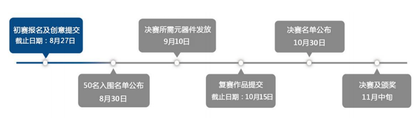 物联网的应用场景是十分复杂化与碎片化的,现场展示的只是冰山一角,未来物联网对于我们的影响肯定是全方位的,物联网到底能在哪些地方散发魔力呢,这需要我们一起共同探索。艾睿电子为了促进物联网的发展,发挥物联网爱好者与创新者的创造力,与合作伙伴举办了《艾睿IOT创意设计大赛》,大赛的赛程将分为初赛报名及创意提交、50名入围名单公布、决赛所需元器件发放、复赛作品提交、决赛名单公布以及决赛及颁奖这六大环节(赛程明细见下图)。此次创意大赛最终优胜的冠军将获得10,000美元的奖金,亚军为5,000美元,季军则为3,000美元(奖金均为税前)。最后,冠亚季军都将可获得Indiegogo国际性众筹平台的支持,以及可在艾睿电子每年一度的Arrow Centralized Training亚太区活动中展示制成品。
