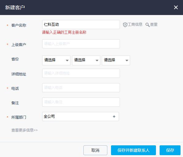 如果销售人员没有选择任何一个准确的企业名称,则无法录入客户名称,销售易CRM可以校验客户名称有效性。