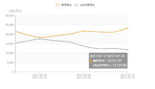 在周使用次数双月走势即6月5日至11日-7月17日至23日中,摩拜单车从18269万次增长至23313万次,增幅为28%,ofo小黄车从17443万次下滑至11727万次,降幅为33%。