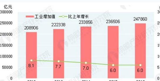 首先,经过多年的发展积累,我国已经形成门类齐全的工业体系,主要的传统工业生产部门产出水平位居世界前列,为发展智能制造装备行业提供了雄厚的工业物质基础。2016年,全部工业增加值247860亿元,比上年增长6.0%。