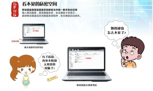 使用盾盘系统,可以在电脑上分出一个安全硬盘,用户可以将要加密的资料放进安全硬盘里进行加密。安全硬盘有一个好处,那就是只有在插上移动盾盘的时候,安全硬盘才会显示出来,而拔掉移动盾盘之后,安全硬盘就会自动隐形消失不见,任谁也找不到,打造一个只有您一个人都能看见的私密空间。